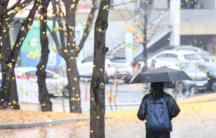 전국 대부분 지역에 비가 내린 25일 대구 경북대학교 캠퍼스에서 대학생이 우산을 쓰고 은행나무 아래를 지나가고 있다