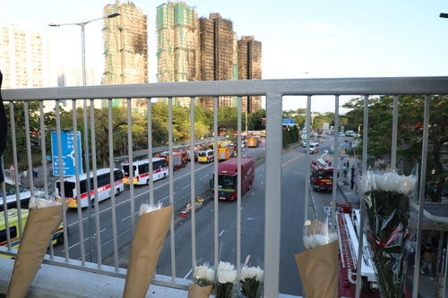 화재가 일어난 홍콩 아파트 인근 육교에 놓인 꽃다발 화재가 일어난 홍콩 아파트 인근 육교에 놓인 꽃다발(홍콩= = 28일(현지시간) 화재가 발생했던 홍콩 북부 타이포의 아파트 단지 ‘웡 푹 코트’ 인근 육교에 피해자들을 추모하는 꽃다발이 놓여있다. (끝)