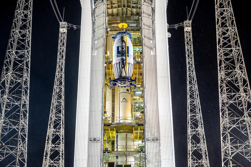 아리랑 7호(서울= 사진은 기아나 우주센터에서 기립해있는 베가C에 실린 아리랑 7호. [아리안스페이스 제공. 재판매 및 DB 금지]