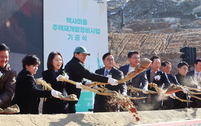 오세훈(왼쪽 네 번째) 서울시장이 1일 노원구 중계본동 백사마을 주택재개발사업 기공식에서 첫 삽을 뜨고 있다. 왼쪽 세 번째부터 최호정 서울시의회 의장, 오 시장, 우원식 국회의장, 오승록 노원구청장
