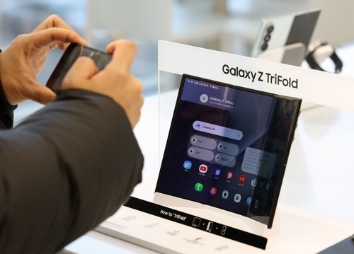 12일 서울 강남구 삼성 강남에서 한 시민이 ‘갤럭시 Z 트라이폴’을 보고 있다.