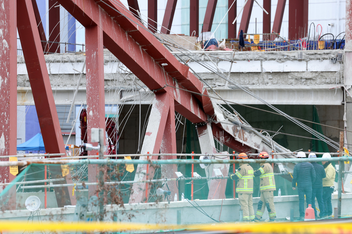 광주대표도서관 붕괴 사고 사흘째인 13일 오전 광주 서구 치평동 사고 현장에서 구조 당국 관계자들이 현장을 둘러보고 있다. [