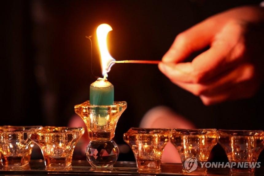 14일(현지시간) 호주 본다이 해변에서 발생한 총격 사건의 희생자들을 기리기 위해 주 프랑스 호주 대사관 앞에 설치된 하누카 촛불