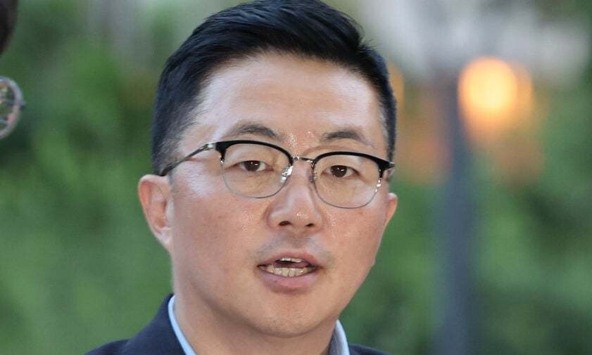 김건희 여사 일가의 ‘집사’로 지목된 김예성씨가 지난 8월12일 귀국 직후 인천국제공항에서 체포돼 서울 종로구 김건희특검 사무실로 들어서며 취재진의 질문에 답하고 있다
