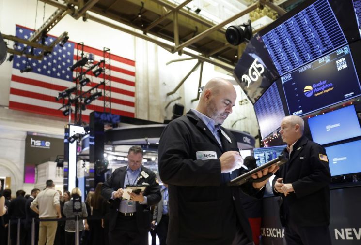 미국 뉴욕증권거래소(NYSE) 거래장에서 트레이더들이 업무를 보고 있다. UPI
