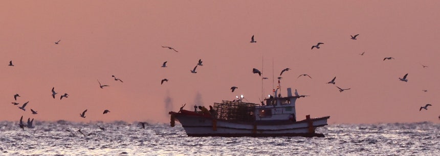 지난 23일 오전 부산 수영구 광안리 앞바다에 조업을 마무리 중인 어선 위로 갈매기들이 만선을 반기며 날갯짓하고 있다