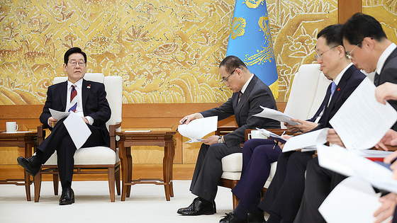 이재명 대통령이 29일 대통령실 이전 작업이 마무리된 청와대로 출근한 뒤 참모진과 차담을 하고 있다