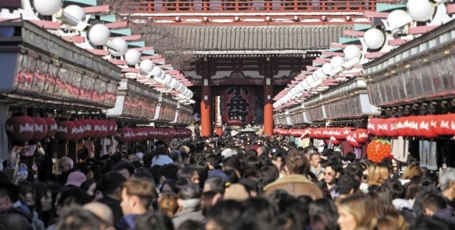 일본 도쿄의 인기 관광지인 아사쿠사의 나카미세 거리 상점가가 관광객으로 가득 찬 모습. EPA