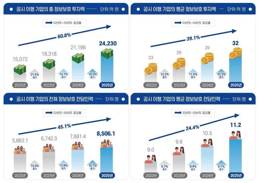 과학기술정보통신부가 2025년 정보보호 공시 현황을 분석한 보고서에 따르면, 공시 의무 대상 기업 773개사의 정보보호 투자액은 2조4230억원으로 전년 대비 14.3% 증가했다. 전담인력은 8506명으로 전년7681.4명 대비 10.7% 증가했다.